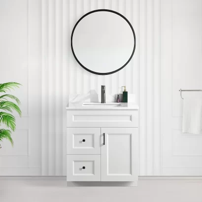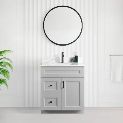 Tesoro 30” Shaker Bathroom Vanity with Quartz Countertop (MDF)This 30-inch bathroom vanity and sink is a perfect combination of style and function, making it a great choice for homeowners in Toronto and across Canada. Whether you’re renovating a small bathroom or a powder room, this vanity brings both elegance and functionality to your home.
