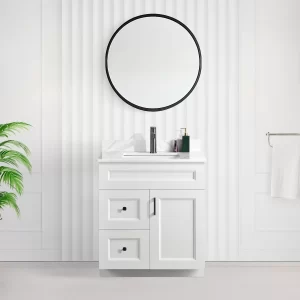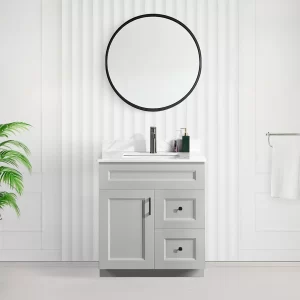 With its Shaker-style doors and clean lines, this vanity blends seamlessly into different decor styles. The durable MDF construction ensures longevity, while the soft-close drawers and doors provide a quiet and smooth experience. Available in white, grey, and blue, it allows you to choose a colour that complements your space.