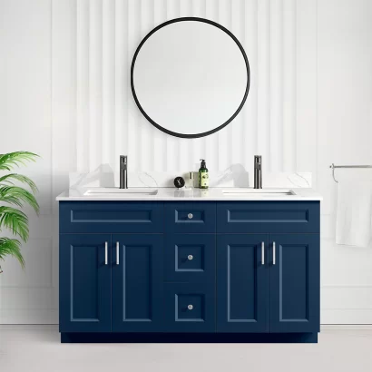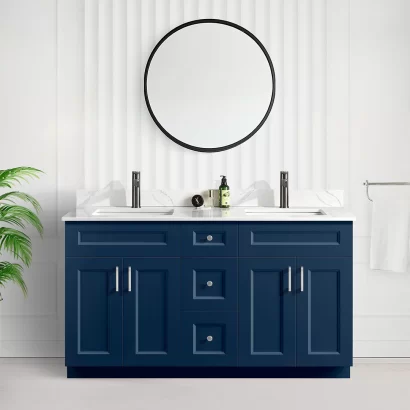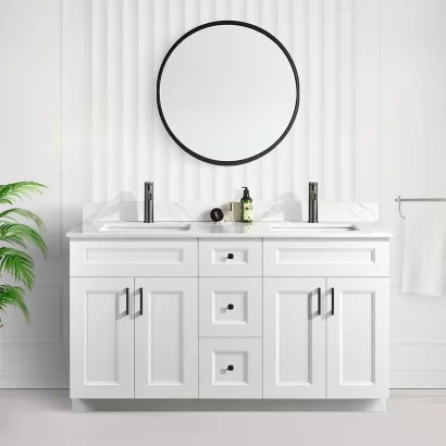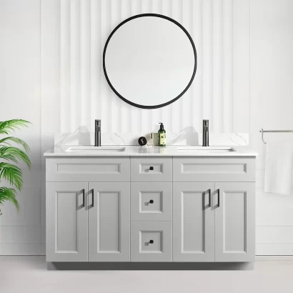 Tesoro 60″ Double Sink Shaker Bathroom Vanity With Quartz Countertop (Solid Wood)A bathroom vanity is more than just a piece of furniture—it’s a statement of style and functionality. The Tesoro 60-inch bathroom vanity brings a perfect balance of classic design and modern convenience, making it a great addition to any bathroom, whether in Toronto or anywhere else in Canada.